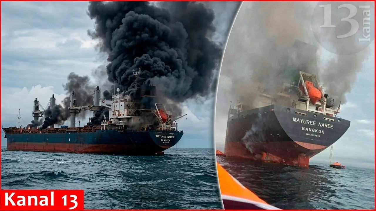 Images released by Royal Thai Navy shows Thai cargo ship set ablaze in Strait of Hormuz