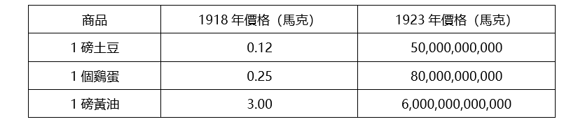 更准确来说,截至 1923 年 11 月 15 日,帝国银行共计发行了 928 亿亿马克(9.28 × 10的19次方)。抱歉我没法说的更清楚了,因为中文里面还没有对应的术语。这种天文数字般的货币供应当然会导致天文数字般的物价指数,以三种日常家用商品为例,1918 - 1923 年德国的物价变化如图 1: