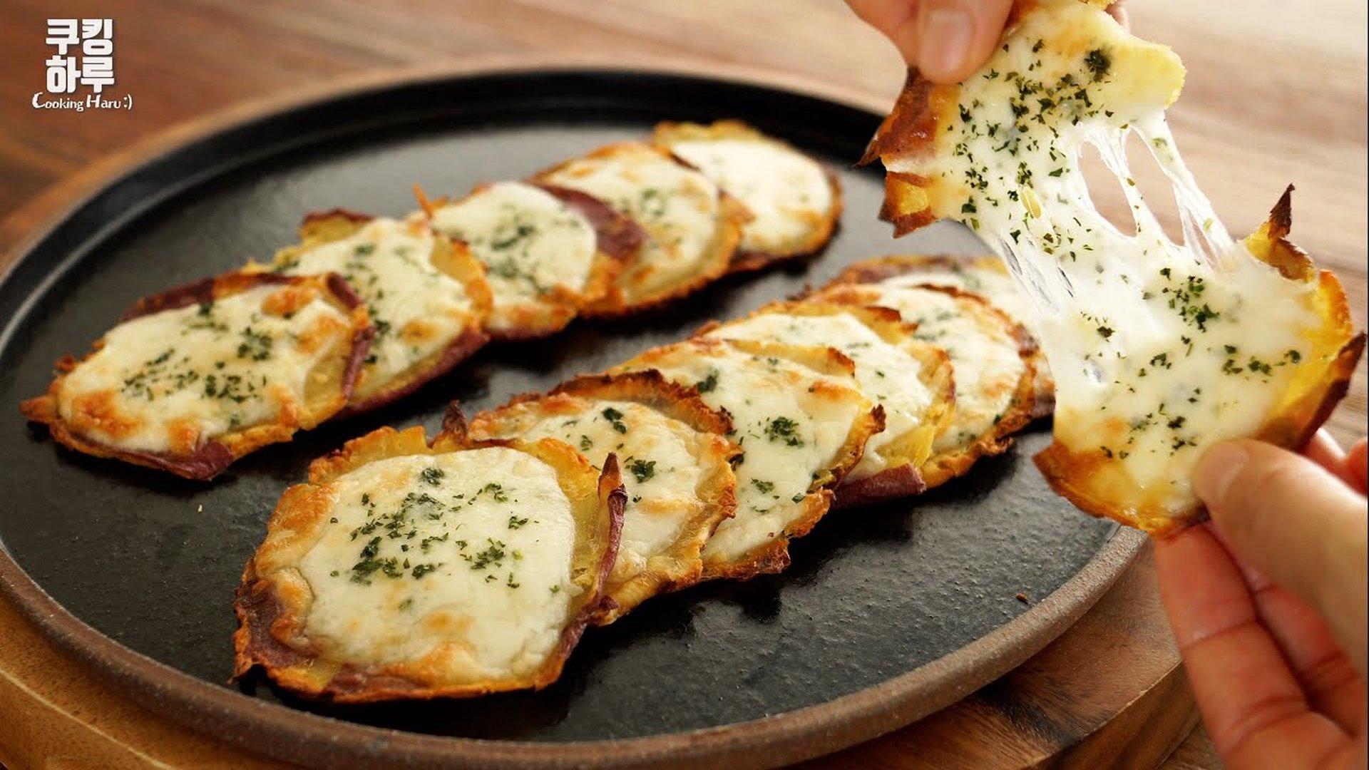 It's tastier than potato chips!! 2 sweet potatoes!! Crispy!! Mini sweet potato cheese pizza!!