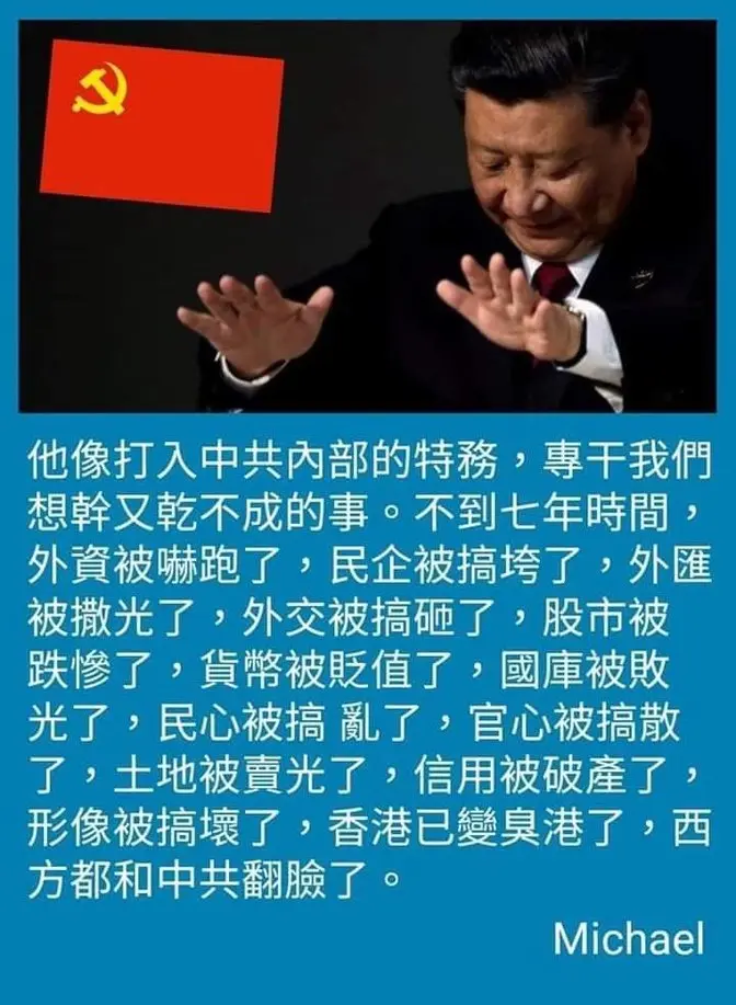 現在中國大量的社會問題、香港問題、台灣問題、國際外交問題,都是習近平一個人的問題造成的,就像當年文革十年前後毛澤東掌權極左路線一樣年年大量餓死人年年有上百萬中國人被殘酷政治迫害死虐殺死謀殺死,毛澤東把整個中國變成人間地獄,把世界上所有文明發達國家都當作敵人。毛澤東死後中國撥亂反正中國再也沒有餓死人沒有階級鬥爭對人民的政治迫害虐殺屠殺,世界上所有文明發達國家都成了中國的友好國家,都對中國的改革開放都對中國的經濟發展和科技教育衛生醫療的進步做出貢獻,直到2012年習近平上台後大開歷史倒車重回毛澤東邪教治國的文革路線,把中華人民共和國把中國大陸人民第二次帶入人間地獄。 。 。 。