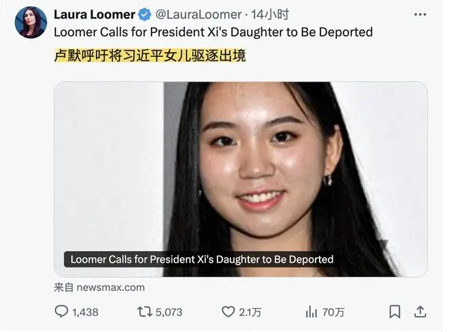 2025年5月30日美国国会议员劳拉·卢默在X平台发帖文要求驱逐住在美国的习近平女儿习明泽!