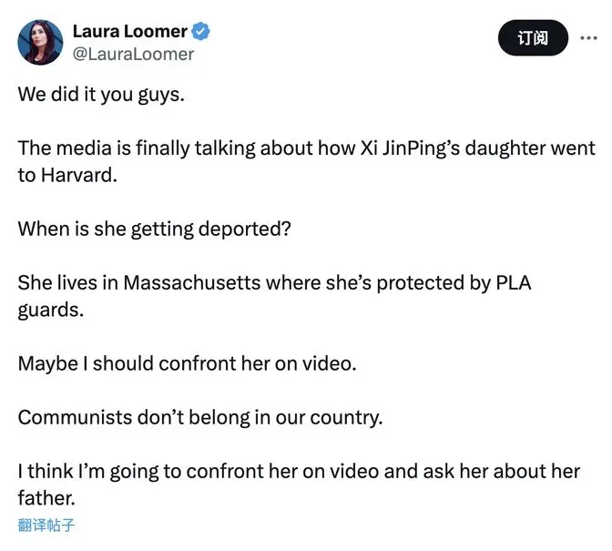 美国国会议员美国右翼活动人士、记者劳拉·卢默(Laura Loomer)2025年5月30日在X平台爆料,称中共国家主席习近平的女儿习明泽居住在马萨诸塞州,并由中共人民解放军(PLA)卫兵提供私人安保!她公开呼吁:“驱逐习明泽!共产主义者不属于美国!” 并在帖文@美国国务卿卢比奥。卢默甚至扬言要拍摄视频当面对质习明泽,询问其父亲相关问题!