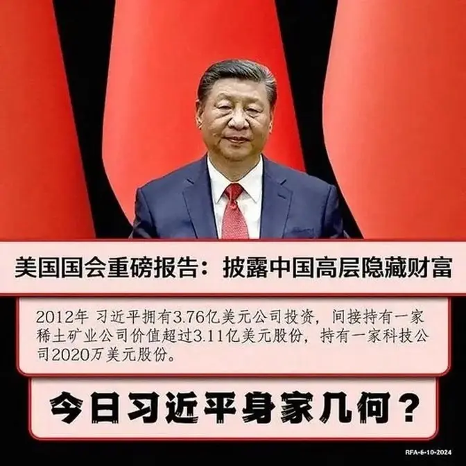 来源:2024年6月11日自由亚洲电台:美報告揭習近平利用親屬隱藏逾7億美元財富 評論:讓百姓看清「國家大盜」真面目