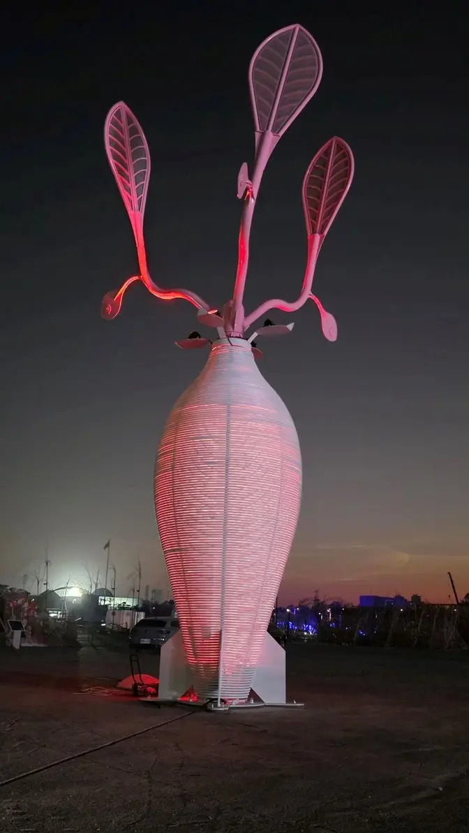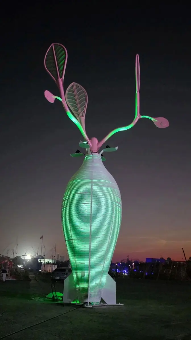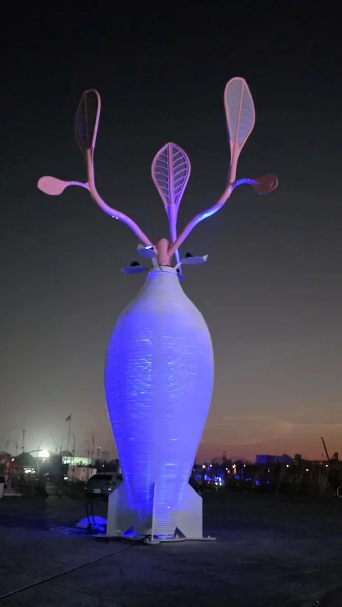 主燈設計巧妙導入風動裝置,讓三槓枝葉隨自然風律動搖曳,生動詮釋「生活、生產、生態」三生共融的農村再生精神;夜間則透過精緻燈光設計,自金屬結構中層層透射漸層色彩,使整座巨樹宛如會呼吸的生命體,展現人與環境和諧共生的當代美學。