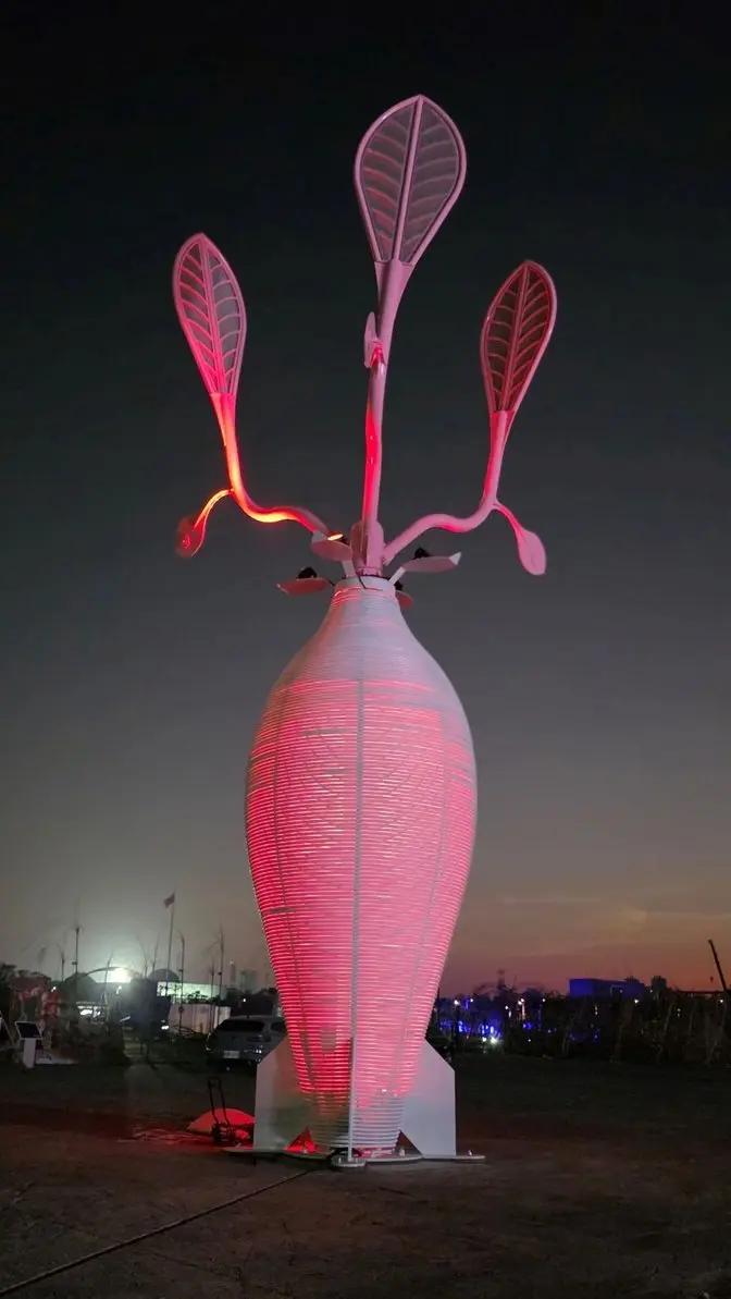 「無際夢想-巍然巨樹」下方獨特的「火箭尾翼」造型,為作品注入向上發射的動能意象,象徵農村在傳承中勇敢轉型,帶著夢想蓄勢升空,展現再生不息的前進力量。